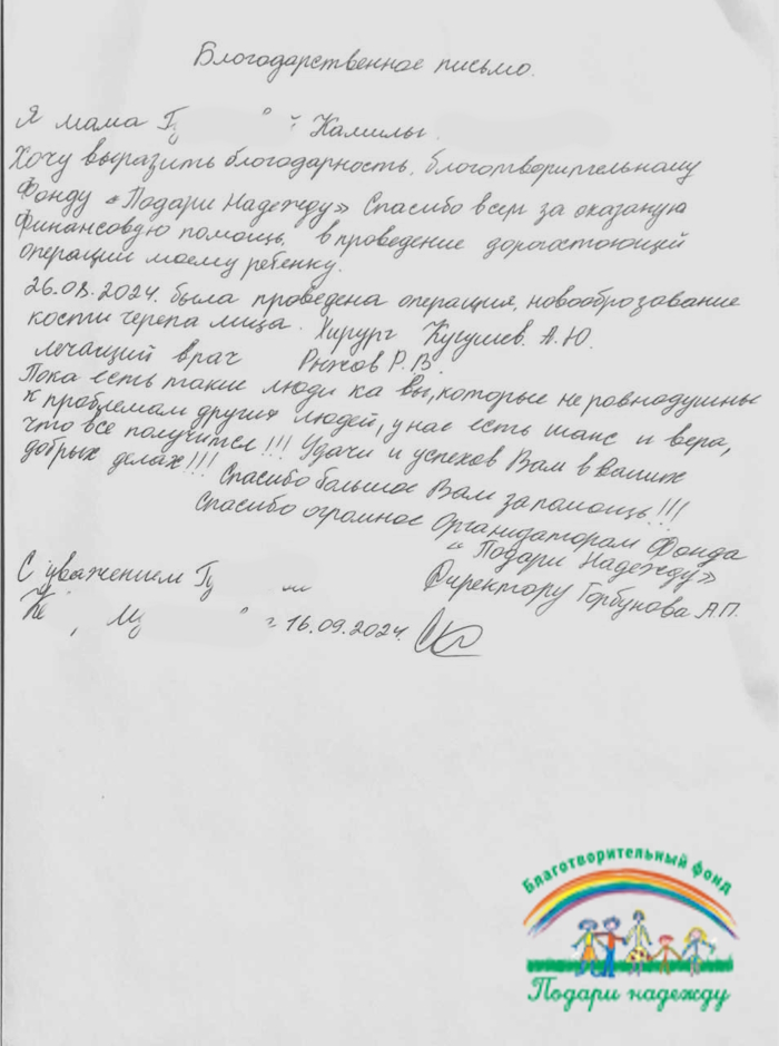 «Хочу выразить благодарность Благотворительному фонду „Подари надежду“. Спасибо всем за оказанную финансовую помощь в проведении дорогостоящей операции моему ребёнку.